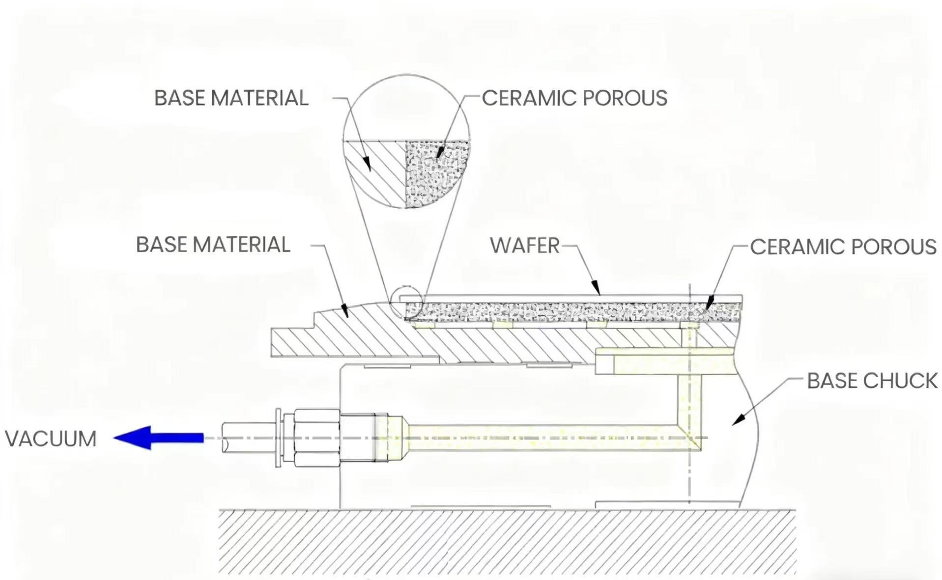 Personalizzatomandrino in ceramica porosacomprende la base e la piastra in ceramica porosa. Collegandosi ad un sistema di vuoto, l'ambiente a bassa pressione viene creato evacuando l'aria tra il wafer e la ceramica. Sotto pressione negativa del vuoto, il wafer aderisce saldamente alla superficie del mandrino, ottenendo infine un fissaggio e un posizionamento sicuri e stabili.