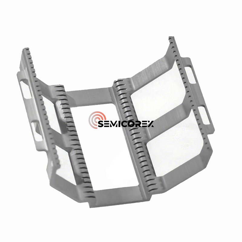 Queste barche possono essere prodotte con varie geometrie complesse e dimensioni specifiche della parte con tecniche di lavorazione e formazione di precisione. I disegni generalmente utilizzano più slot/scanalature parallele per tenere saldamente i wafer in un orientamento orizzontale ed espongono uniformemente l'intera superficie del wafer a condizioni termiche. La spaziatura e gli angoli da slot-slot possono anche essere ottimizzati per adattarsi ai wafer di altri diametri, come 150 mm, 200 mm o 300 mm e il flusso d'aria diretto durante gli effetti di elaborazione pur raggiungendo l'uniformità della temperatura per l'elaborazione.