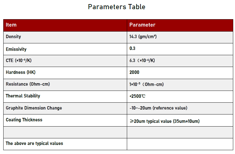 Tantalum carbide is high-performing material with an extremely high melting point (approximately 3880℃), excellent thermal conductivity, superior chemical stability, and outstanding mechanical strength. I parametri prestazionali specifici sono i seguenti: